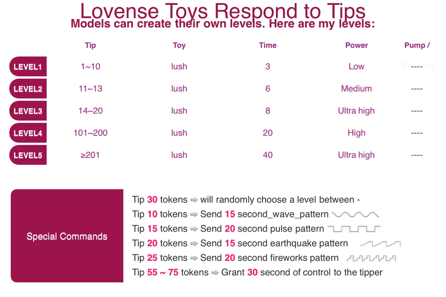 Pik beoordeling, Dirty Talk, Flashing, Voetfetisj, Masturberen, Tepelklemmen, Olie show, Rollenspel, Spanking, Striptease, Topless, Cameltoe, Dildo of vibrator, Op z'n Hondjes, Vingeren, Kokhalzen, Hakken, Vernedering, Aftrek opdracht, Orgasme, Seksspeeltjes